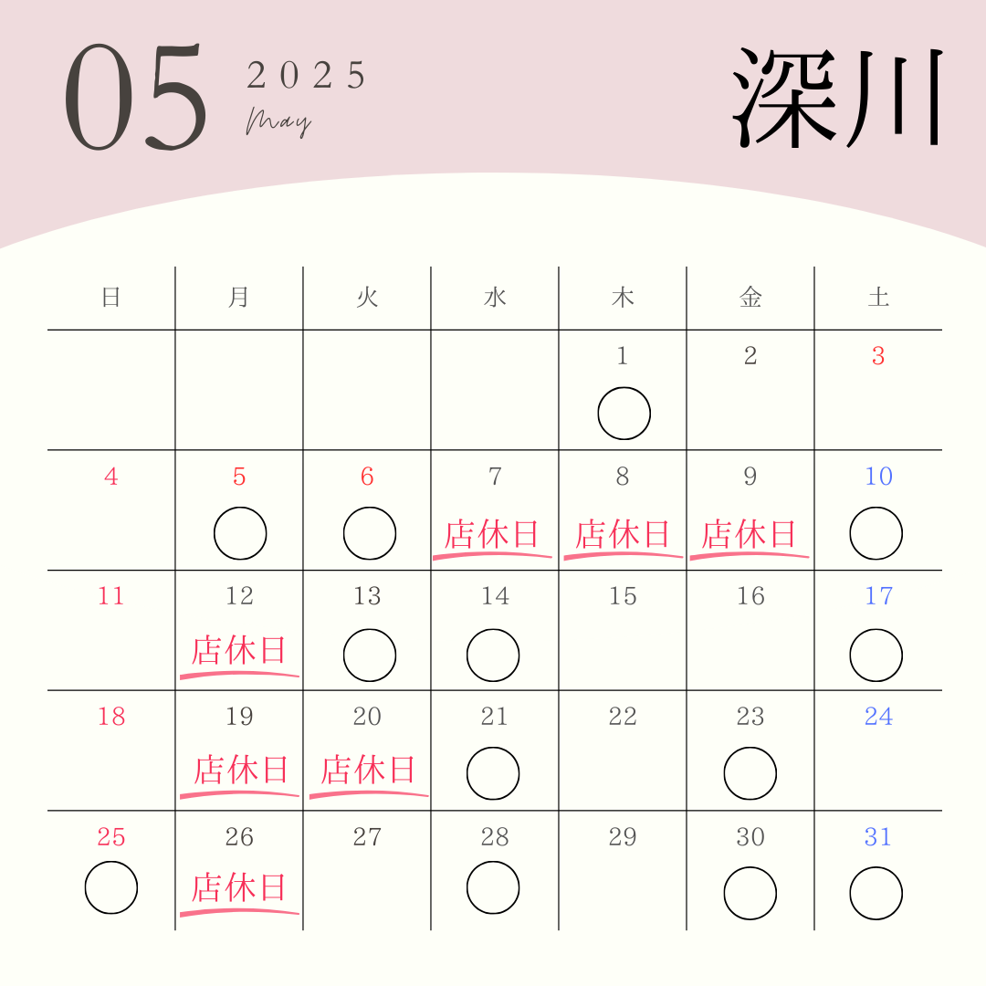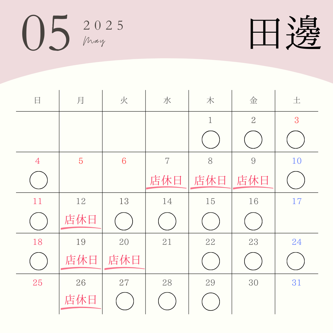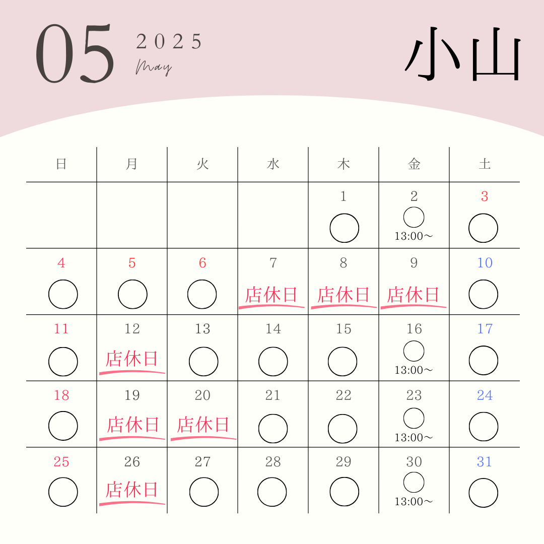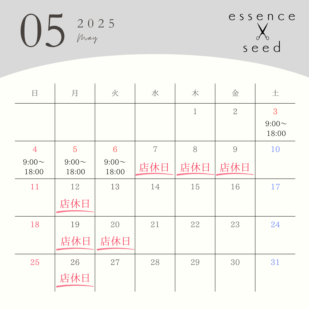 5月の店休日・スタイリスト出勤日は以下の通りです。