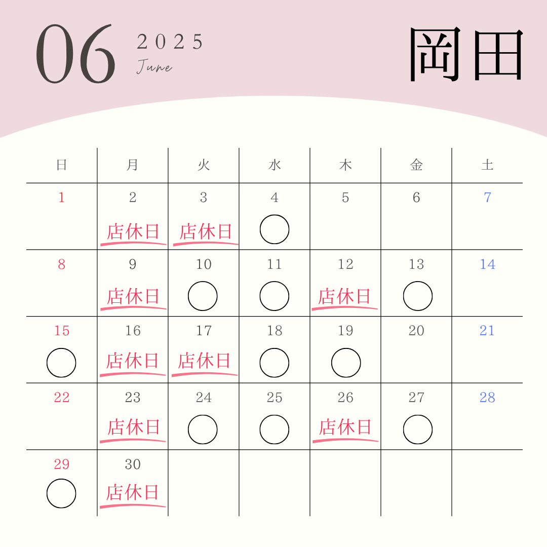 6月の店休日、スタイリスト出勤日は以下の通りです。